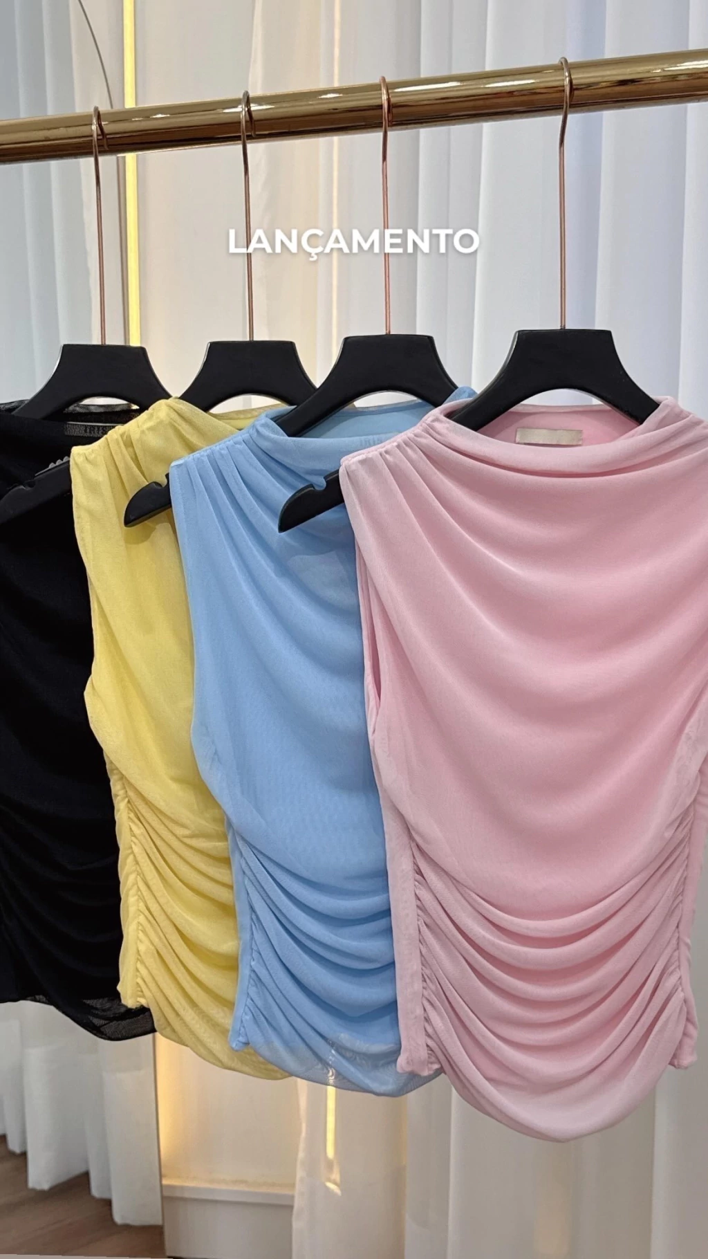 A Blusa em Tule é moderna e delicada, confeccionada em tule com forro para maior conforto e segurança. Possui modelagem estilo regata, com detalhe de elástico nas laterais que cria um franzido no comprimento, proporcionando ajuste e caimento diferenciado. A gola mediana completa o design sofisticado e versátil, ideal para diversas produções.