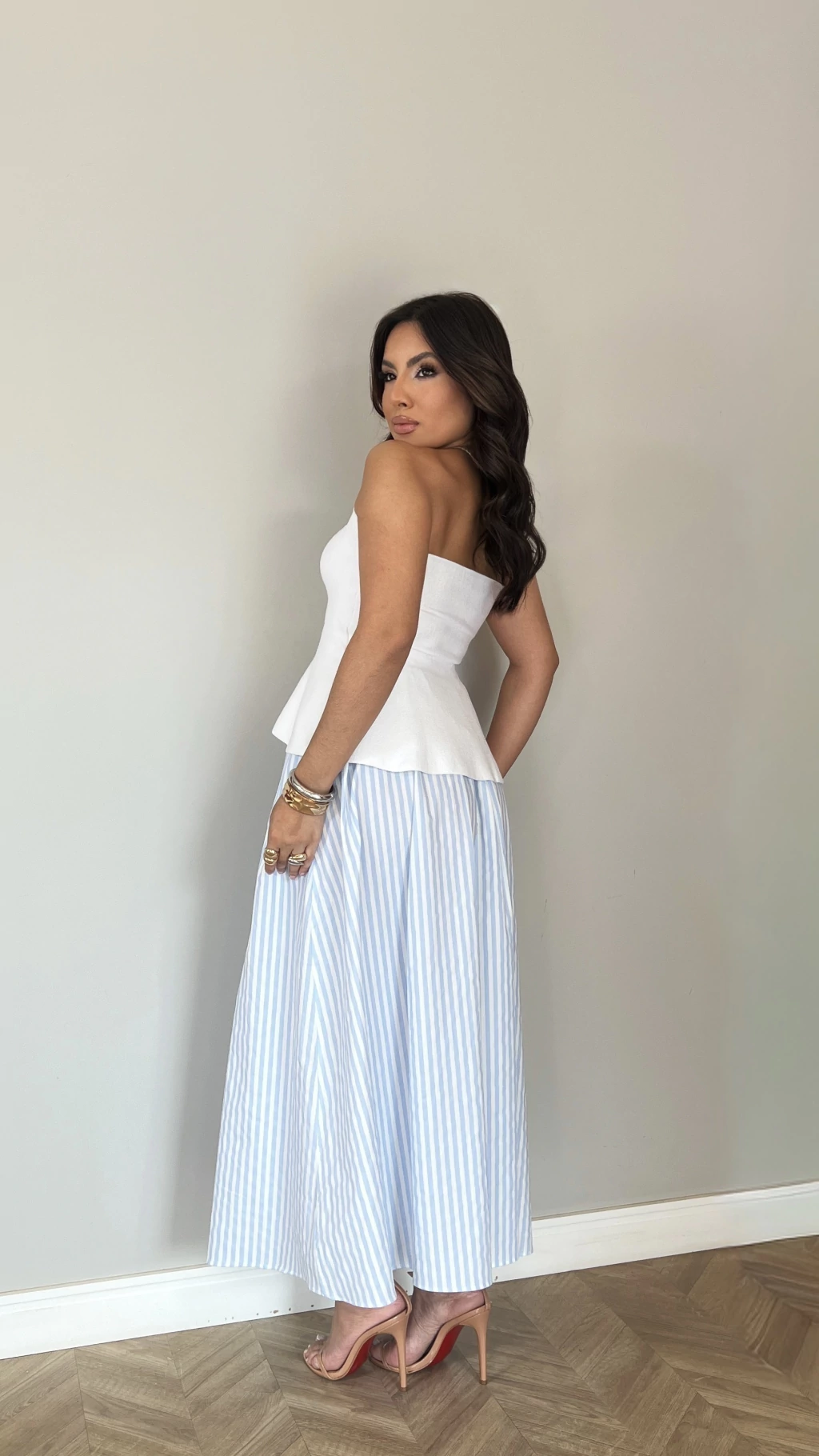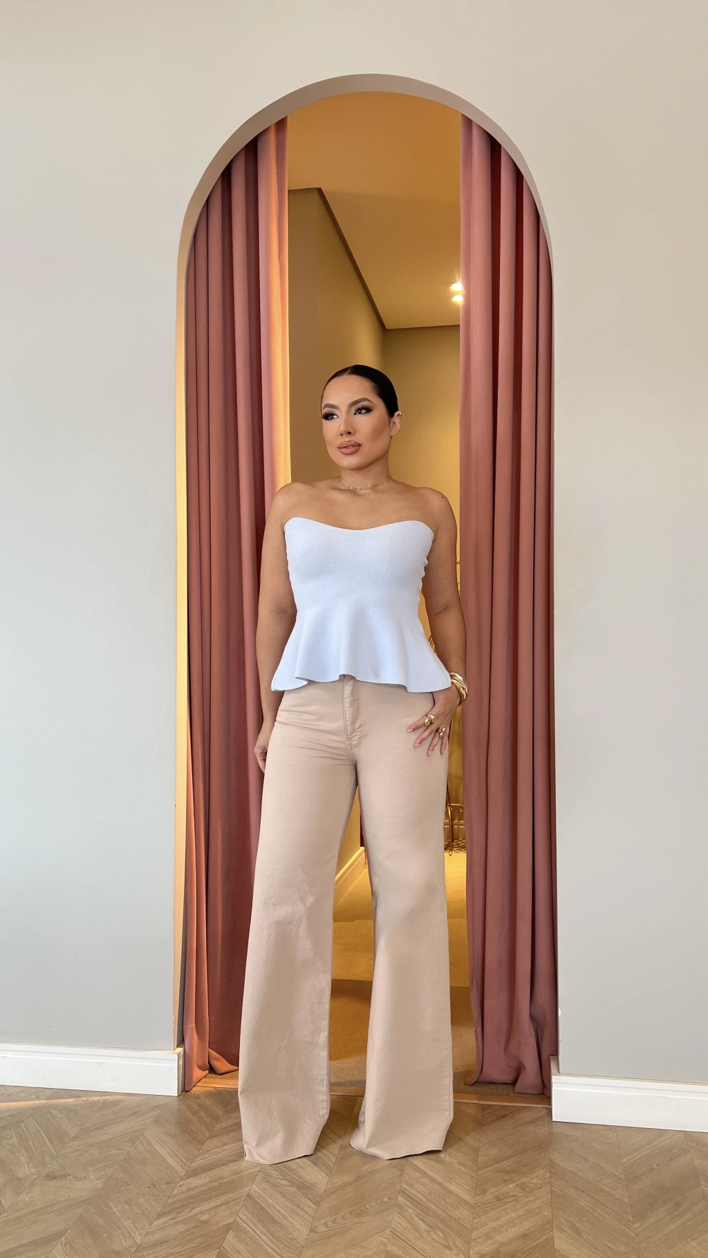 Com decote em coração, sem alças e modelagem peplum, ela valoriza a silhueta e garante um visual delicado e moderno.
