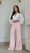 Modelagem pantalona flare, sem cós, zíper invisível na lateral, forro interno.
