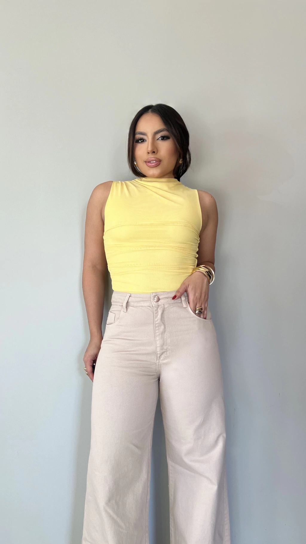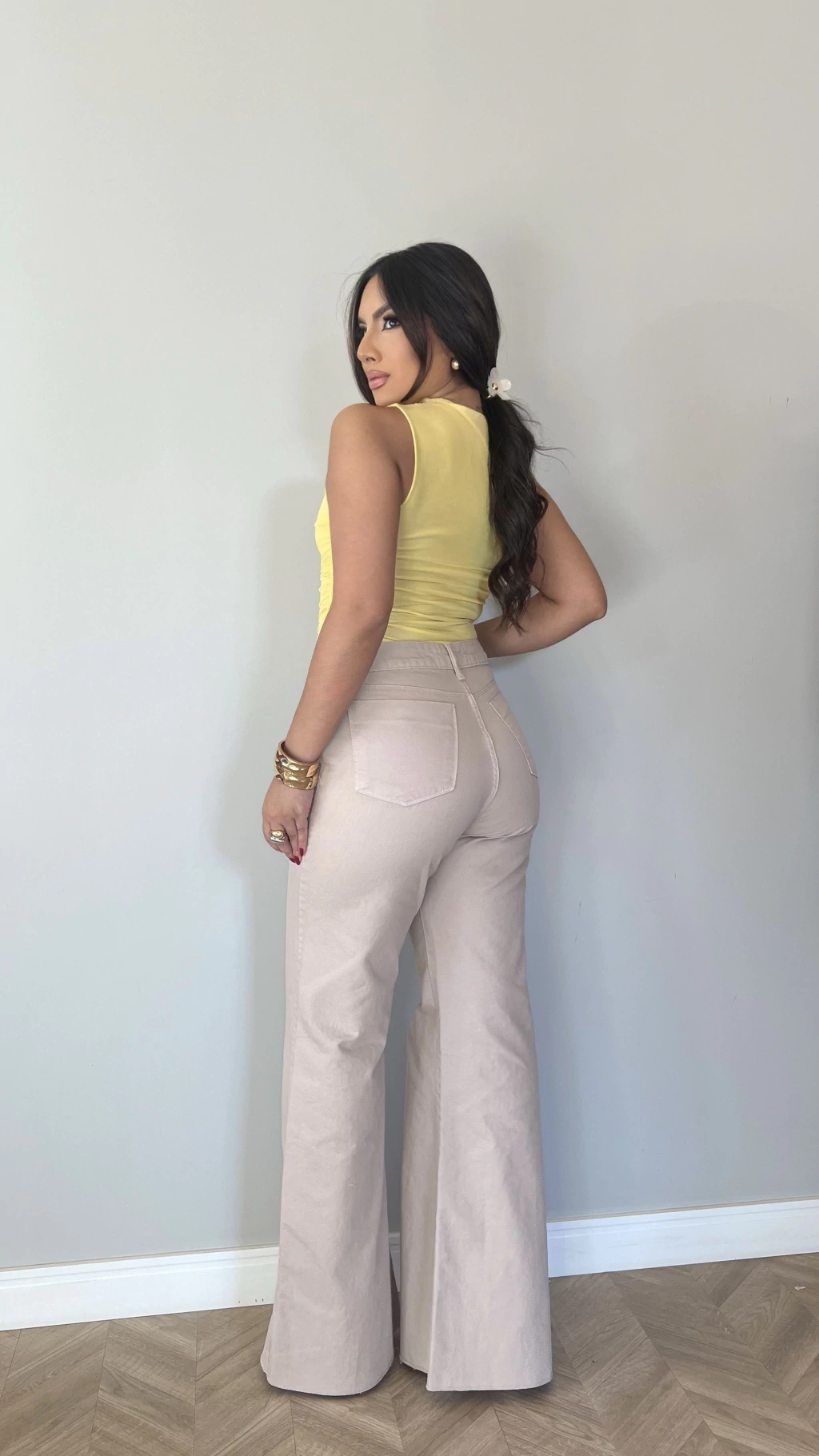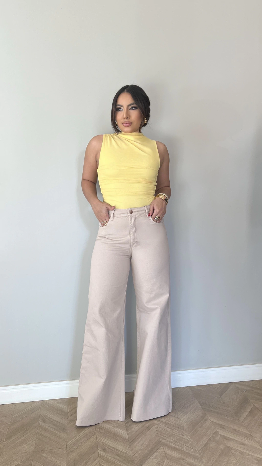 Modelagem pantalona, cós alto, bolsos laterais e traseiros, cor bege claro