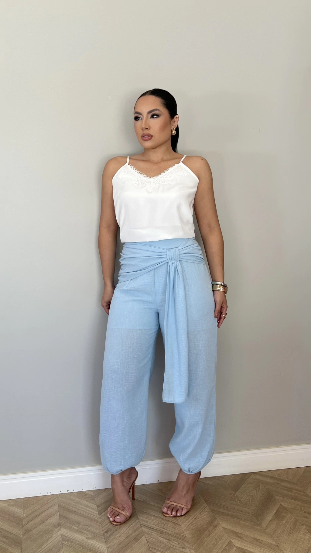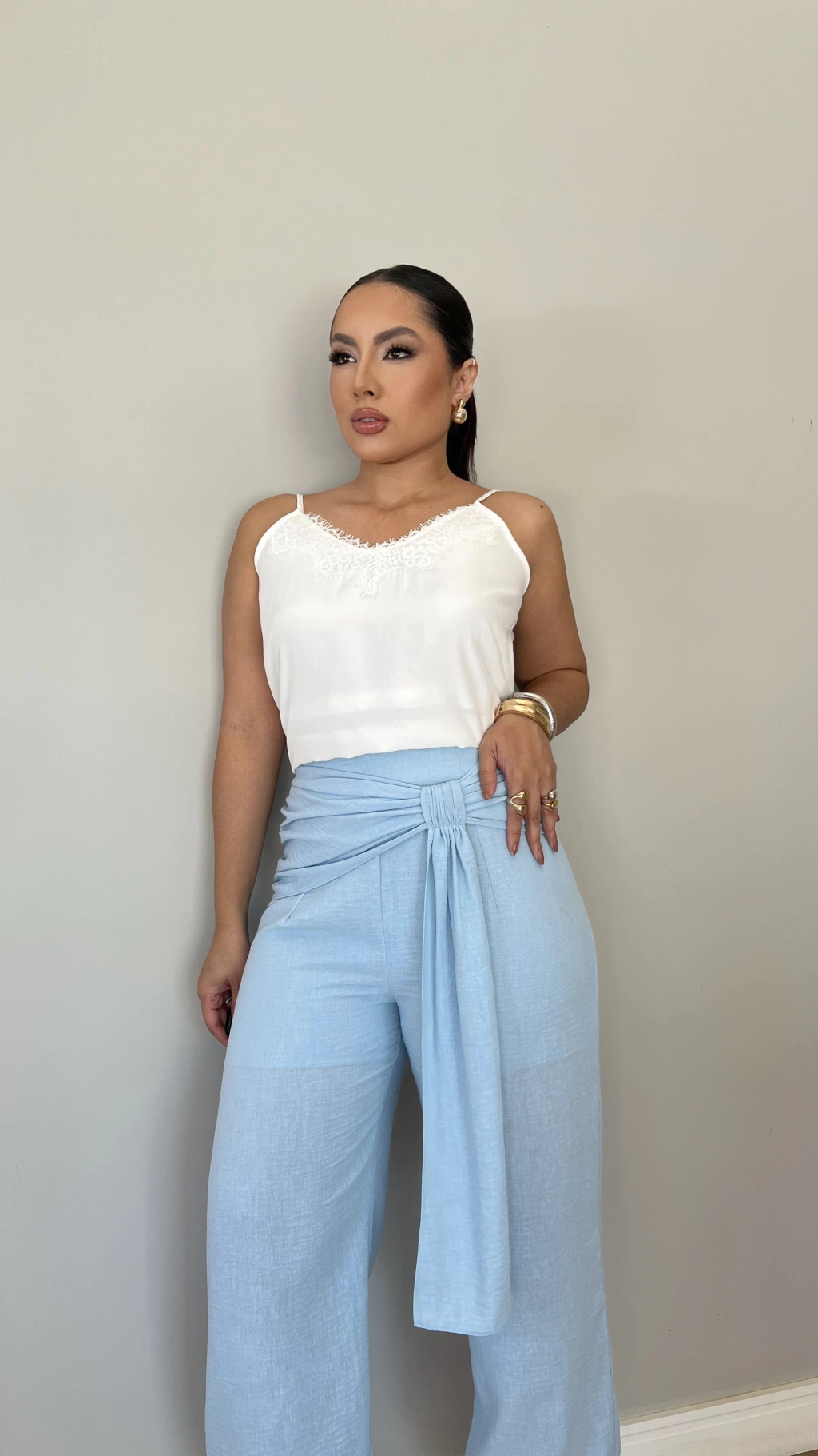 A Calça Alladim Azul é a escolha ideal para quem busca leveza, conforto e elegância em um visual moderno.