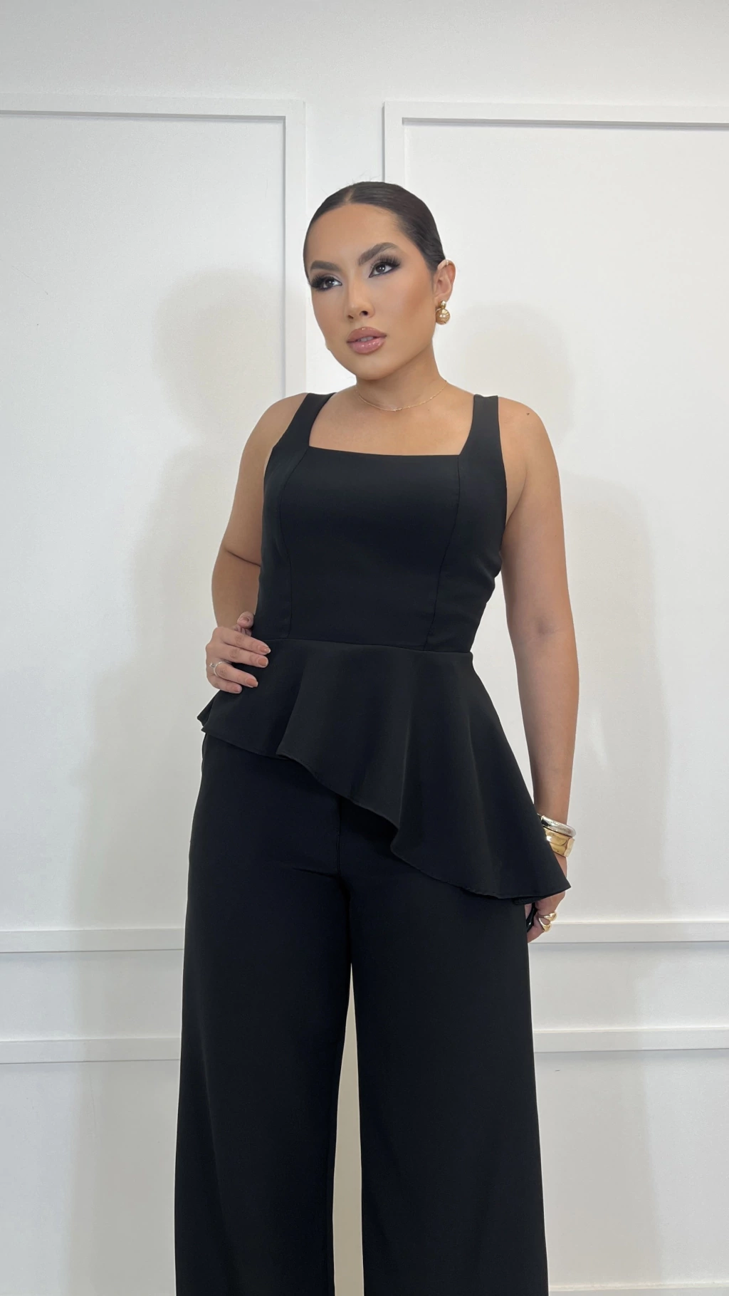 A blusa estilo peplum possui corte ajustado no busto, alças largas, forro duplo na região do busto, zíper nas costas e babado na barra, garantindo caimento estruturado e elegante.