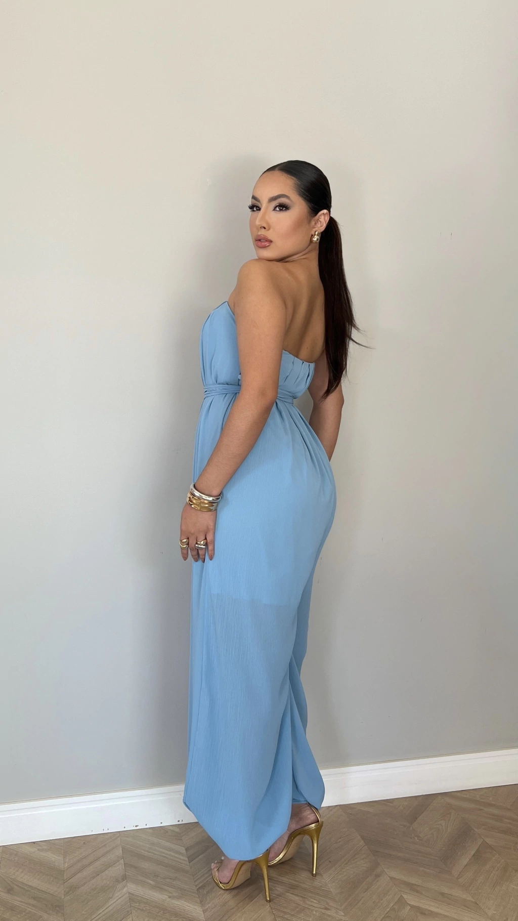 O Macacão Pantalona Azul é a escolha ideal para quem busca sofisticação e praticidade em uma única peça. Com decote reto e plissado na região do busto, o modelo valoriza o corpo de forma elegante e moderna.