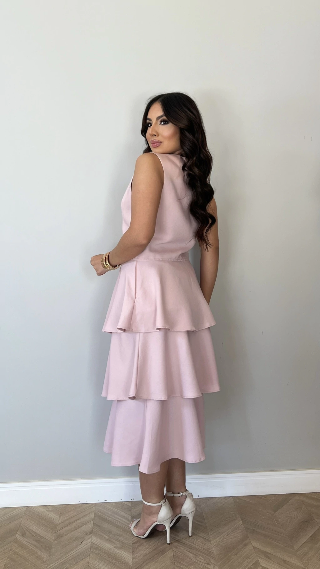 Cós alto, babados em camadas, forro embutido, zíper lateral invisível, disponível nas cores nude e rosé