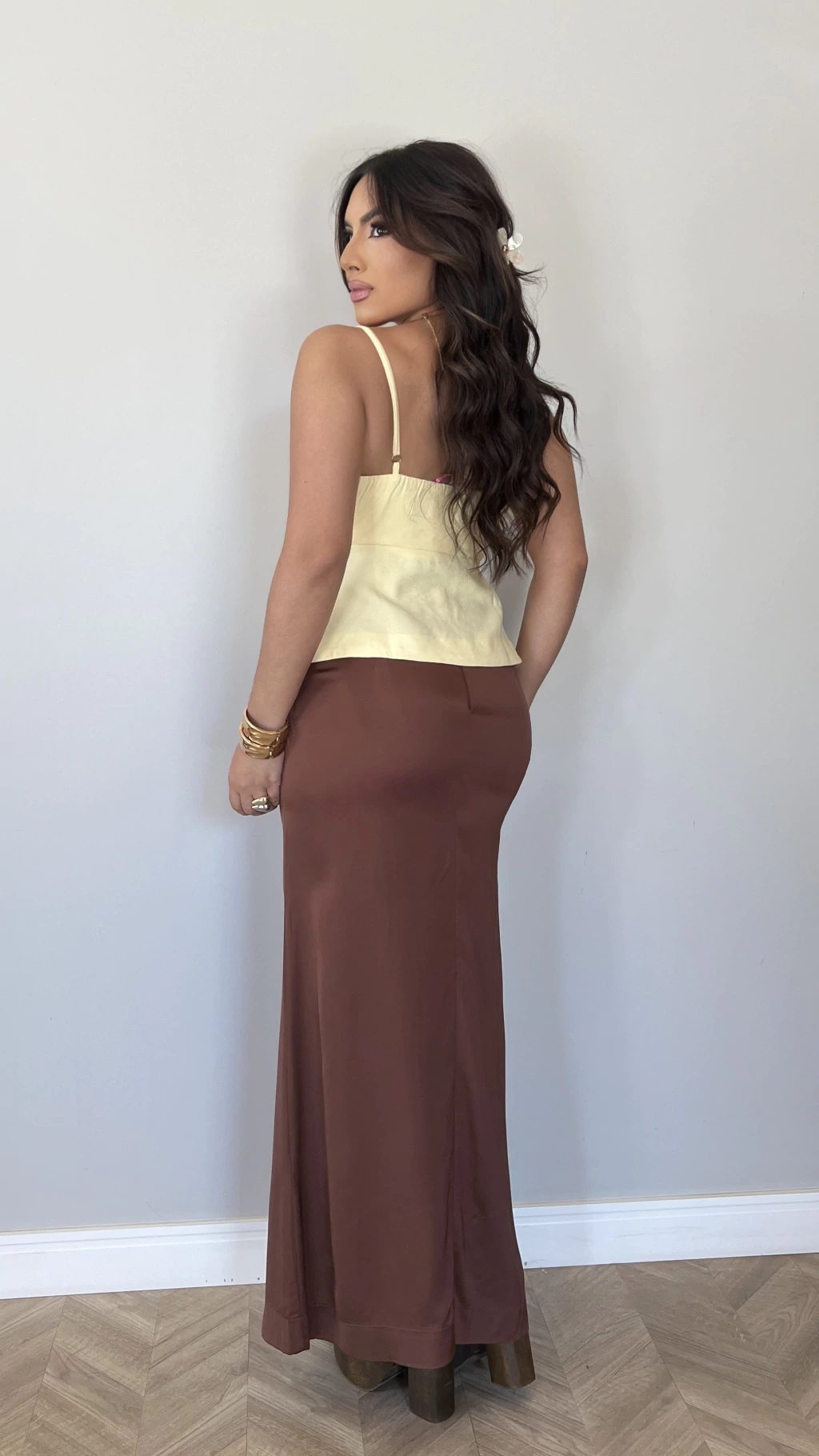 Saia Open é confeccionada em viscose com toque acetinado, que não puxa fios. Possui modelagem ajustada ao corpo, cintura alta e fenda frontal que traz mobilidade e leveza ao visual. Conta com fechamento por zíper semi invisível na parte de trás, mantendo o acabamento discreto.