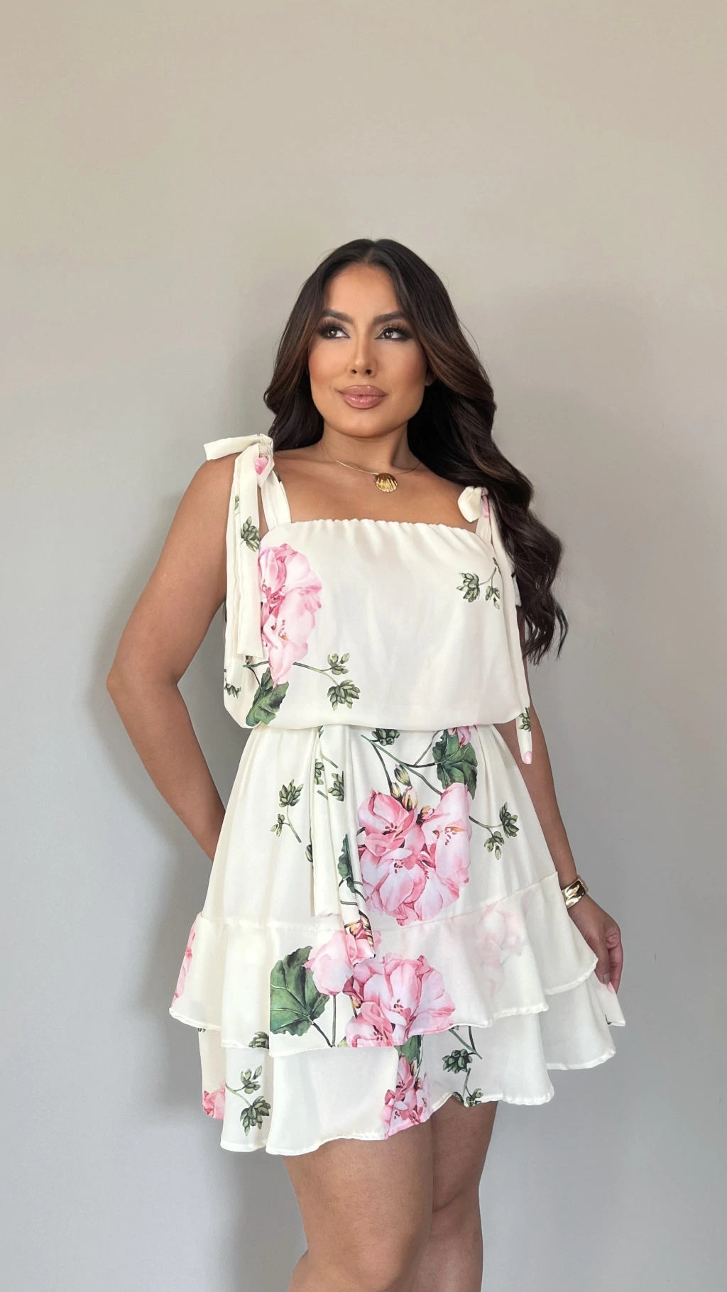 Modelagem curta e soltinha, elástico acima do busto, alças com amarração, faixa na cintura, babados na barra, forro interno